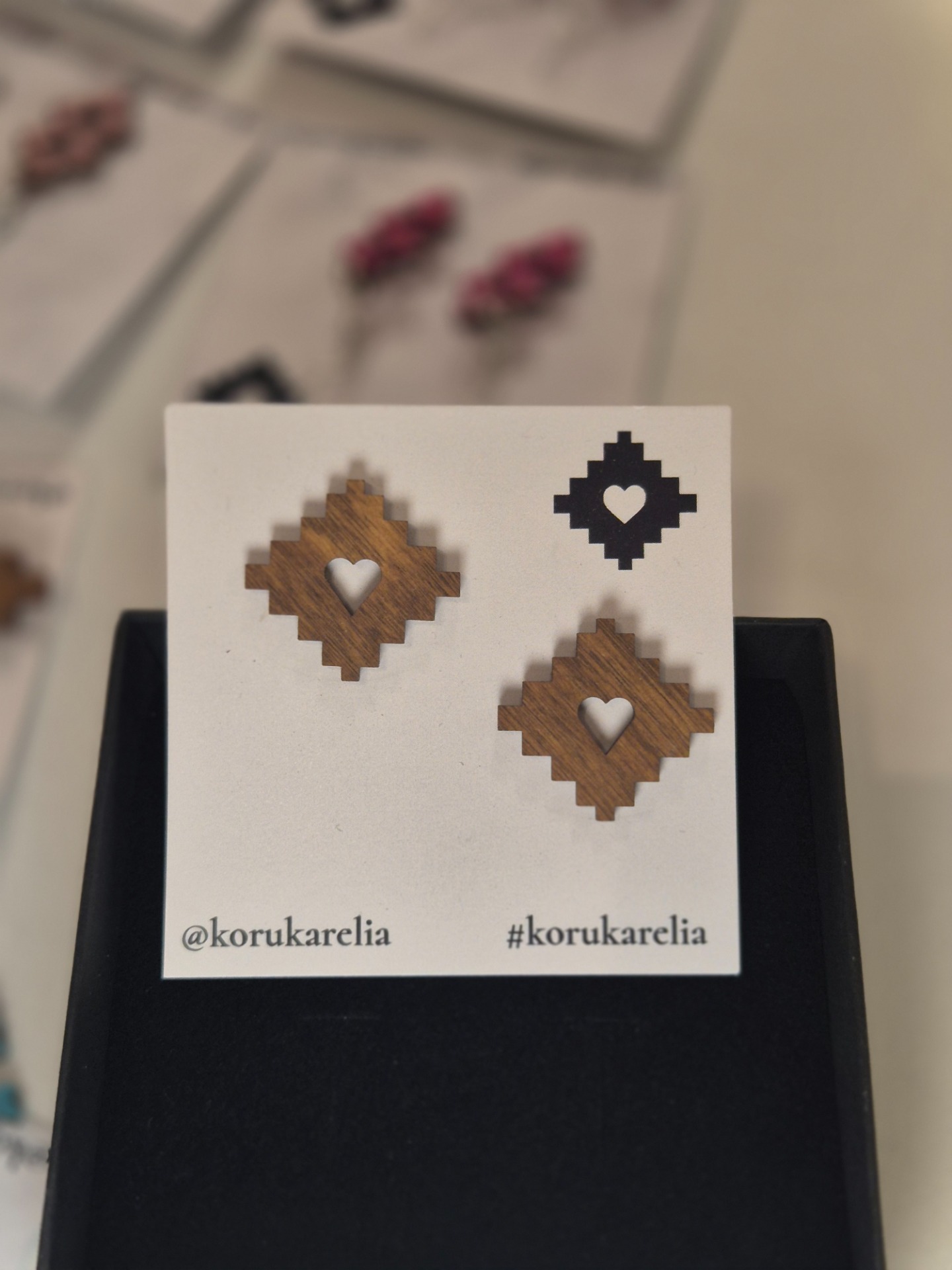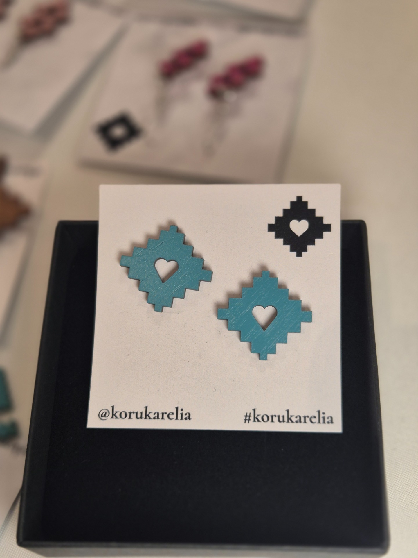 Mimerkki-nappi on räiskyvän värikäs käsinmaalattu nappikorvis ja moderni puukoru selkeällä muotoilulla ja saanut inspiraationsa perinteisistä kirjontamalleista. Mimerkki on Koru Karelian logokorvis ja pikselimäinen muotokieli uudistaa perinteikästä designia moderniksi.